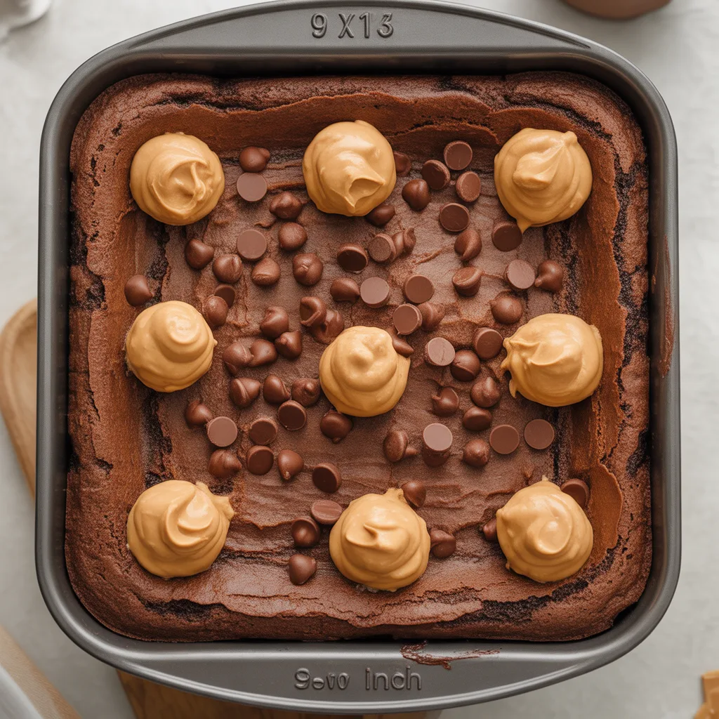 - Now, for the peanut butter. Use a spoon to drop dollops of peanut butter all over the surface. Don’t worry about spreading it or making it perfect. Those big blobs are what create the amazing gooey pockets.