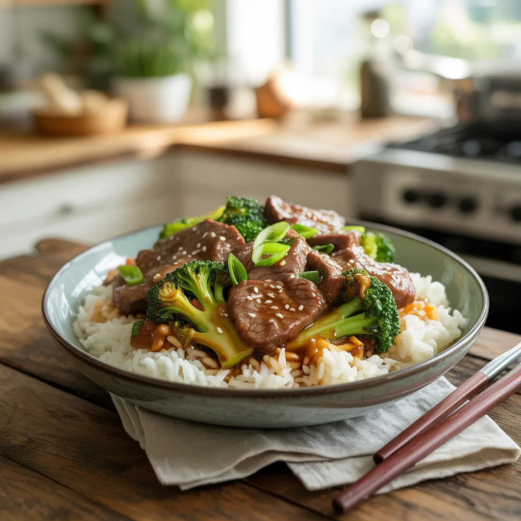 - That’s it! Spoon a generous amount of the beef and broccoli mixture over warm rice in bowls. Garnish with a sprinkle of sesame seeds and some sliced green onions for a pop of color and flavor. Dinner is served.