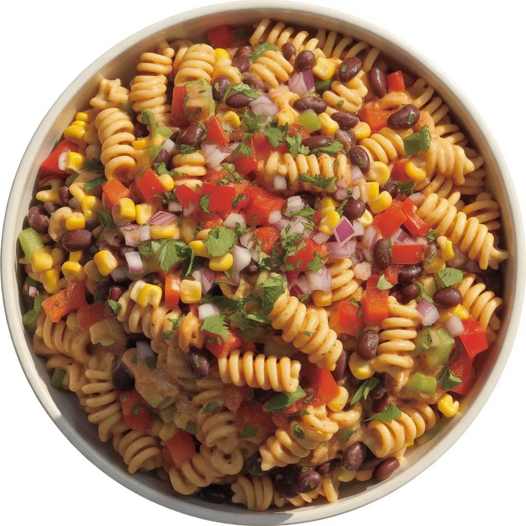 - In a large bowl, combine the cooled pasta, corn, black beans, diced bell pepper, and red onion.