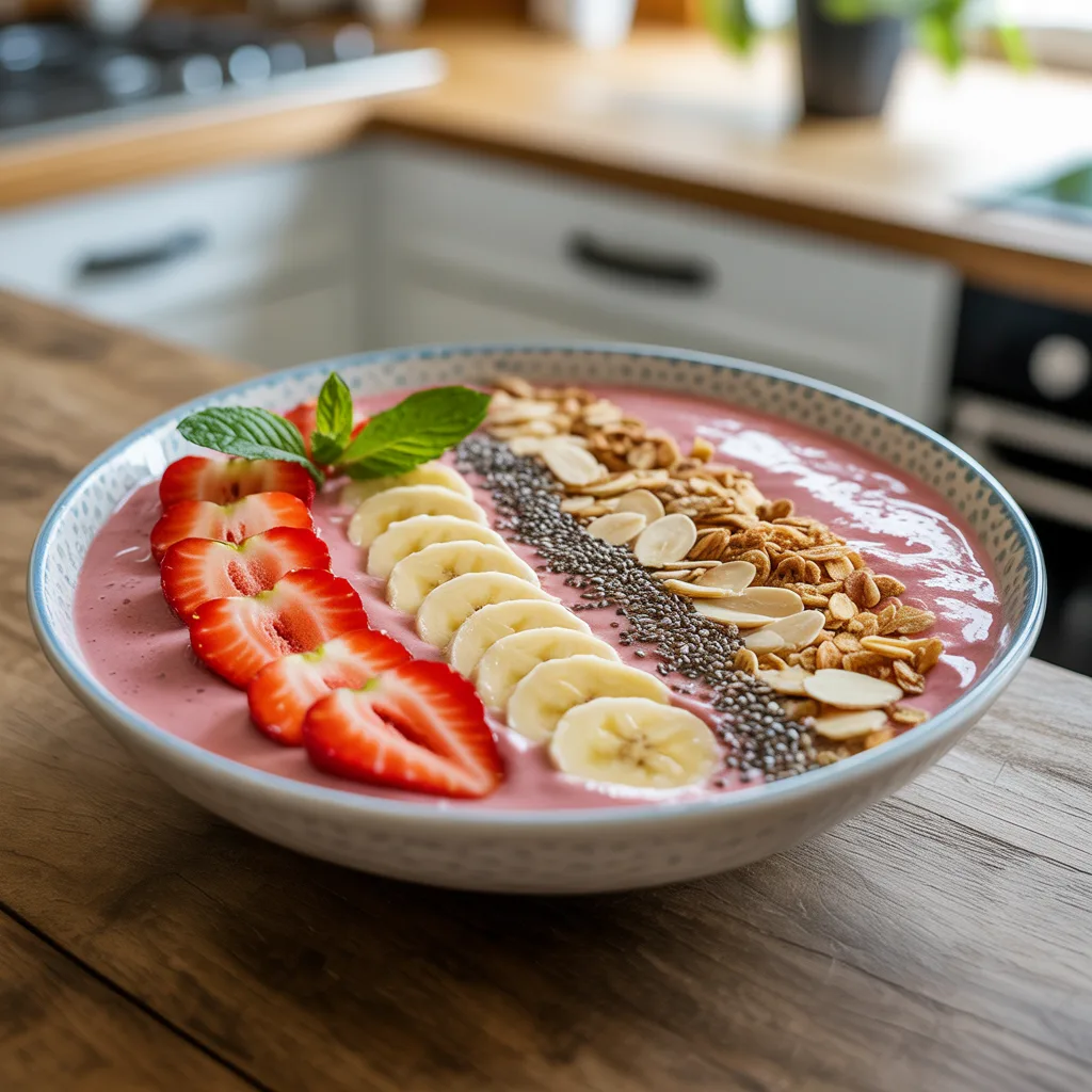 Youโll love this recipe because itโs the ultimate trifecta: fast, healthy, and downright gorgeous. It takes all the comfort of a classic strawberry banana smoothie and turns it into a satisfying meal you can eat with a spoon. The contrast between the cool, creamy base and the crunchy toppings is just so, so good. Plus, itโs incredibly forgiving. Donโt have almond milk? Use oat milk. Out of strawberries? Toss in some frozen peaches. Itโs a choose-your-own-adventure breakfast that fits into any morning routine, whether youโre packing lunches for the kids or heading straight into a video call.